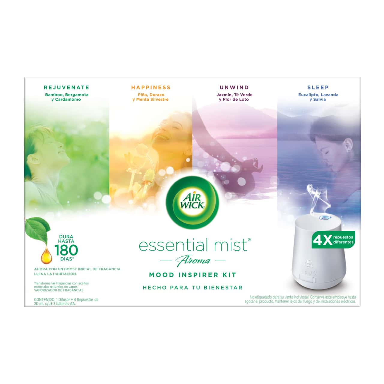 VAPORIZADOR DE FRAGANCIAS, AIR WICK, ESSENTIAL MIST, HAPPINESS, REJUVENATE, SLEEP, UNWIND, 1 DIFUSOR + 4 REPUESTOS DE 20 mL c/u